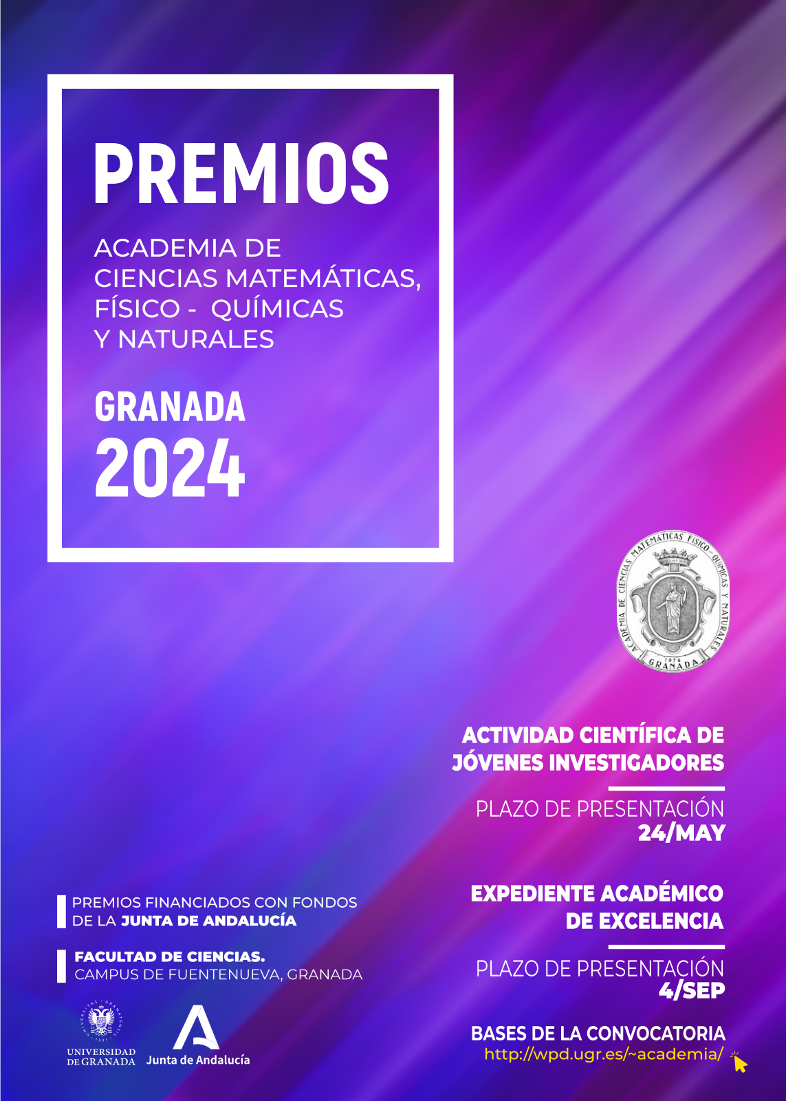 La Academia de Ciencias Matemáticas, Físico-Químicas y Naturales de Granada convoca un premio destinado a reconocer la actividad científica desarrollada por jóvenes investigadores sobre materias relacionadas con las disciplinas que la corporación cultiva.