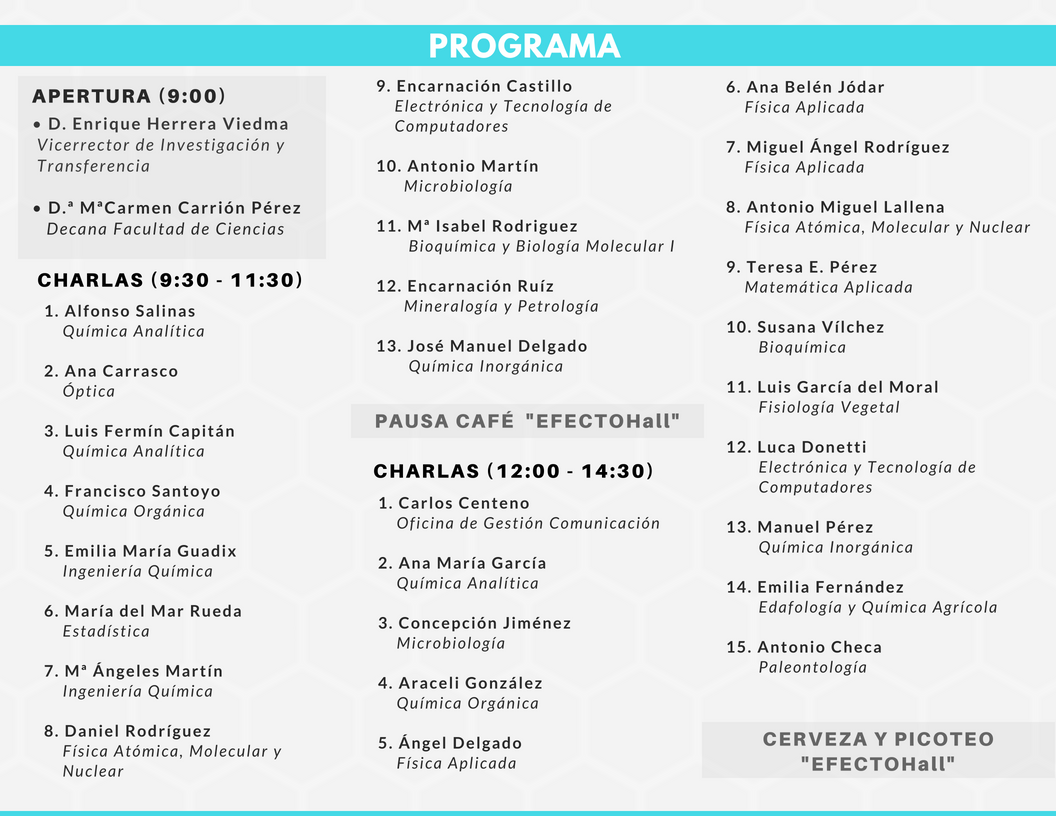 El objetivo de la I Jornada (d)Efecto Pasillo es que los Grupos de Investigación de la Facultad de Ciencias expongan, enformato de micro-charla, sus necesidades y lo que podrían ofrecer a otros Grupos, tanto en conocimiento como en equipamiento.