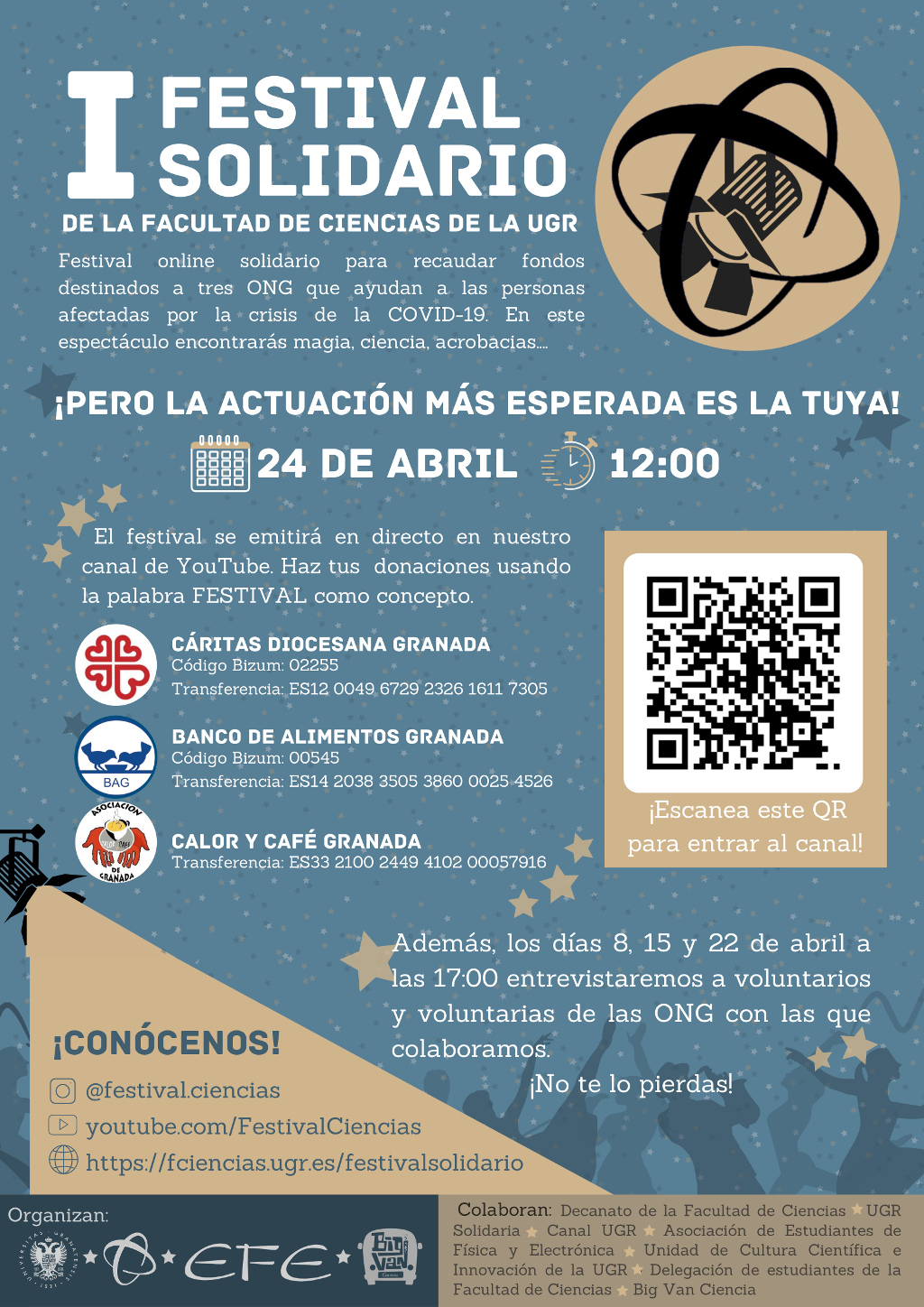 El I Festival Solidario de la Facultad de Ciencias de la Universidad de Granada es un proyecto lleno de ilusión y entusiasmo con el objetivo de colaborar con estas tres asociaciones, y de paso intentar que todos pasemos un rato divertido. Es un evento online que contará con actuaciones musicales, magia, monólogos, divulgación científica, etc., que han preparado con mucho cariño y de forma totalmente desinteresada nuestros/as maravillosos/as colaboradores/as. El festival se estrenará en abierto el próximo sábado 24 de abril de 2021 a las 12:00h, en el canal de YouTube.