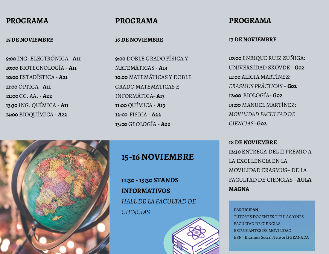 Los próximos días 15-18 noviembre se celebrará en nuestra Facultad la V Feria de Internacionalización. El objetivo de esta, es dar a conocer al alumnado de la Facultad de Ciencias las distintas posibilidades de movilidad internacional que les ofrece la UGR. Esto no implica la suspensión de la actividad académica en esos días.